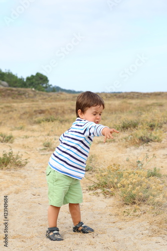 happy little kid throwing sand in a path among dunes