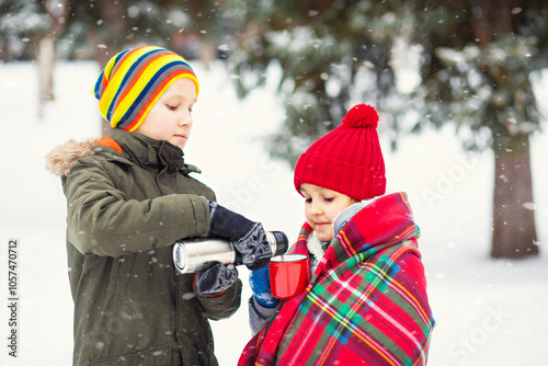 Happy little smiling girl and teen boy standing outdoor in a winter season and drinking cocoa. Holiday concept.