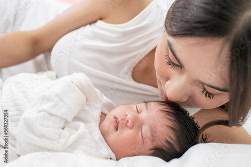 happy loving family. mother playing with her baby hugging in the bedroom , portrait of asian mother playing with newborn baby, health care family love together. asian girl lifestyle..