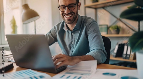 happy, male, accountant, professional, administrator, income, tax, document, laptop, working, desk, office, businessman, computer, business, sitting, work, smiling, cyberspace, men at work, person, smile, manager, job, indoor, boss, executive