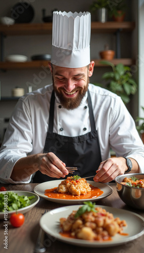 Happy male chef plating gourmet dish with fresh ingredients in modern kitchen