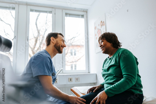 general practitioner, face to face, responsibility, visit, care, day, europa, expertise, photo, color image, horizontal, indoor, communication, smiling, happiness, doctor, physician, doctors office, check-up, mature adult, patient, talking, selective focus, sitting, hospital, nurse, scandinavia, stockholm, sweden, two people, exam