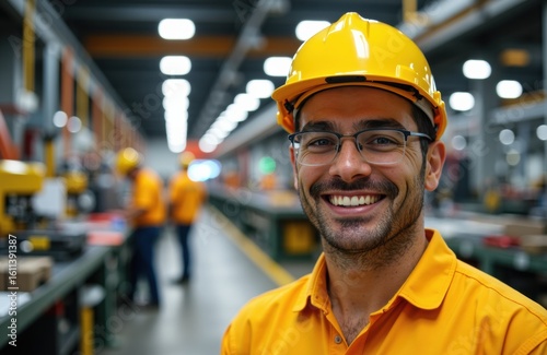 Happy male worker wearing a yellow safety helmet and uniform in an industrial factory setting
