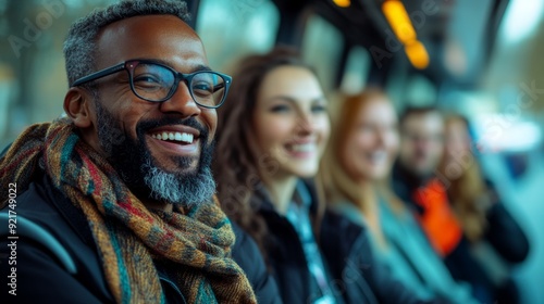 man, male, smiling, happy, joyful, goggles, spectacle, beard, grey hair, foulard, colourful, public transportation, bus, train, subway, commute, travel, journey, city, urban, people, passenger, group, friends, diversity, positive, social, community, transportation, urban life, lifestyle, joy, happiness, laughing, good mood, optimistic, expression, facial expression, closeup, portrait
