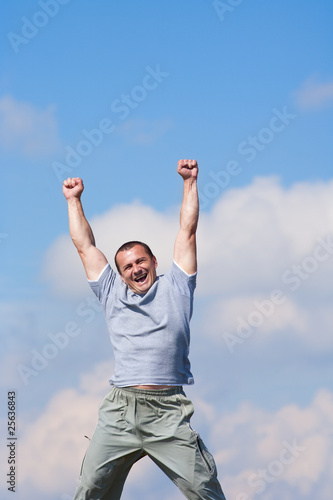 joy, joyful, laugh, teeth, arm, stretched, happy, smile, fun, man, sitting, nature, sky, cloud, blue, t-shirt, casual attire, clothing, to sit, portrait, photogenic, young, adult, 30s, strong, expression, freedom, outside, people, person, 1, single, alone, caucasian, white, healthy, lifestyle, guy, boy, fit, enjoyment
