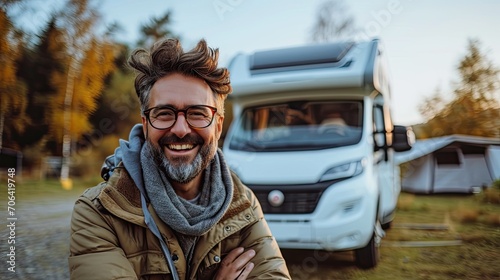 Happy man takes a selfie in the woods, with a van behind him, vanlife concept.