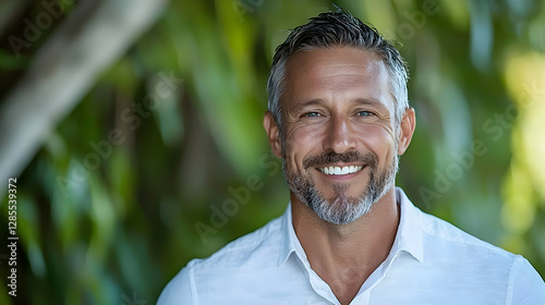man, smiling, happy, mature, outdoors, nature, portrait, background, healthy, lifestyle, adult, person, male, face, expression, joyful, cheerful, confident, photogenic, attractive, smile, teeth, white, shirt, eye, hair, skin, beard, grey, model, people, human, image, photograph, photo, picture, guy, man, gentleman, middle-aged, senior, professional