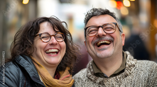 laughter, happiness, joy, cheerful, smiling, couple, casual attire, human relationships, affection, togetherness, friendship, laughing, lifestyle, emotion, positivity, people, person, adult, middle-aged, mature, casual clothes, outdoors, city, street, urban, building, architecture, modern, background, day, bright, warm, light, sunny, carefree, merriment, gleeful, delighted, buoyant, blissful, elated, convivial, genial, jovial, merry, amicable, amiable, content