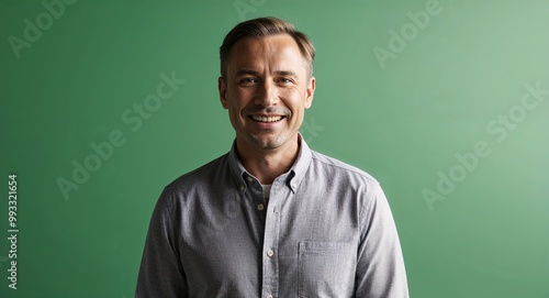 happy, middle-aged, caucasian, man, short, hair, wearing, shirt, plain, green, background, businessman, person, business, people, face, 1, photogenic, model, man, smile, smiling, guy, expression, fashion, boy, confident, casual attire, mature, looking, beard, studio, head