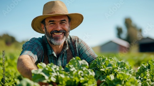 farmer, agriculture, harvest, vegetable, outdoors, countryside, rural, middle-aged, man, beard, tan, plaid, shirt, straw, hat, sunny, day, field, barn, green, plant, crop, gardening, horticulture, happy, nature, organic, produce, lifestyle, farmland, growth, summer, seasonal, smiling, male, person, profession, labor, dedication, work, life, landscape, fresh, agribusiness, cultivation, traditional, environment, leafy