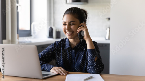 Happy millennial employee, advisor, agent working at laptop from home, talking on mobile phone, giving answer and consultation to client. Indian business woman getting good news from smartphone call