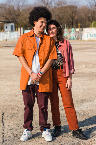 adorable, affectionate, afro, biracial, colourful, cool, couple, cute, daytime, happy, interracial, latino, love, loving, outdoors, outside, car park, portrait, smile, smiling, standing, style, stylish, sunlight, sunny, sweet, together, togetherness, urban, youth