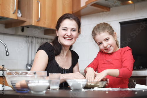 happy mom and kids in the kitchen making dough mixing flour, milk, eggs in a glass bowl