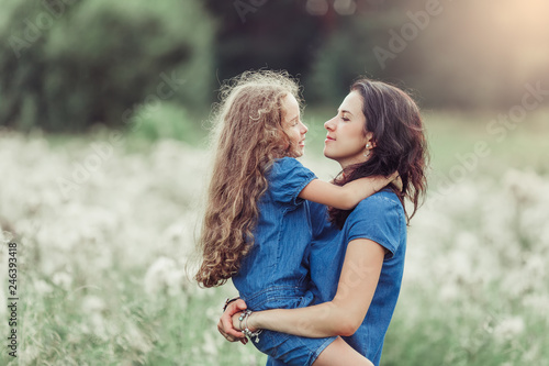 Happy mother and daughter outdoors in the summer having fun together. Motherhood, love, family, happiness concept