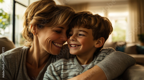 family, mother, son, happiness, love, connection, smiling, indoor, home, together, bonding, affection, warmth, joy, human relationships, parenting, laughter, cosy, casual attire, sweater, candid, children, childhood, comfort, motherly love, interaction, emotional, togetherness, tender, sweet, nurturing, care, closeness, parenthood, joyful, affectionate, fun, cheerful, light, relaxed, lifestyle