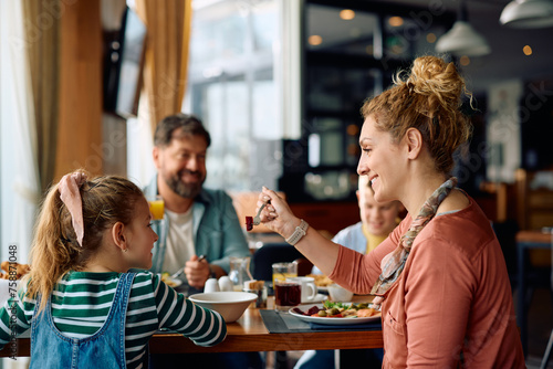 Happy mother feeding her daughter during family breakfast in hotel restaurant.