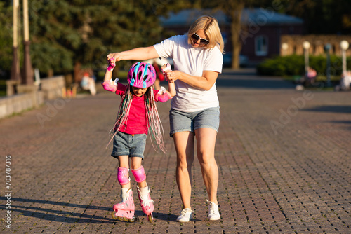 happy mother is teaching her little daughter to ride roller skates in summer park
