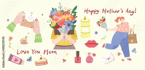 Happy Mother s Day Set of cute and colorful vector illustrations. Kids and their mom, gifts and flowers for the Mother s Day celebration. Design templates for a card, banner