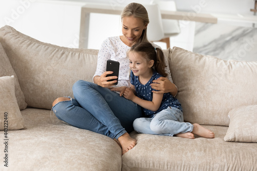 Happy mother with adorable little daughter using smartphone together, hugging, sitting on cozy couch at home, smiling mom holding phone, family making video call, taking selfie, looking at screen