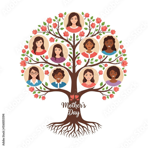 day, family, tree, portrait, happy, woman, generation, diverse, mother, daughter, sister, girl, floral, love, celebration, root, card, design, illustration, vector, stock, image, photo