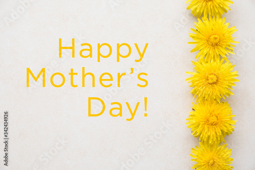 Happy Mothers Day. Yellow dandelions lies on a light textured surface. Wedding card. Flat lay, top view