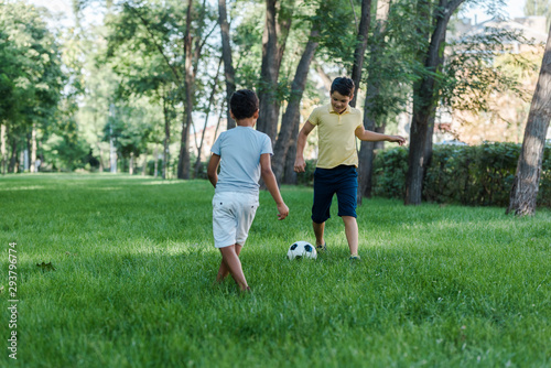 happy multicultural boys playing football on green grass