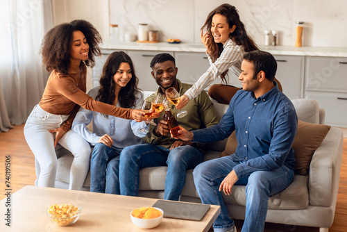 Happy multicultural young people clinking in living room celebrating occasion