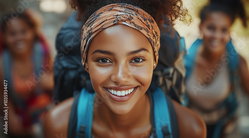Happy, multiethnic woman smiling with friends on an outdoor adventure.