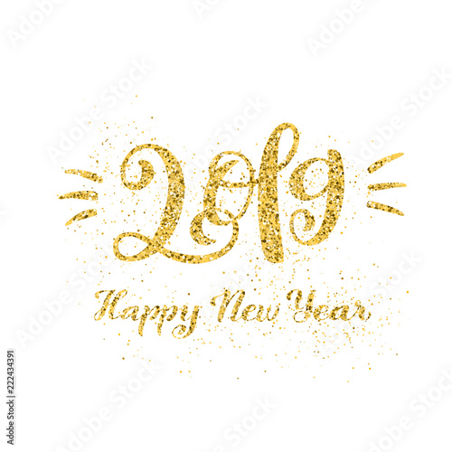 Happy New 2019 Year. Vector illustration. Greeting card for Christmas holydays. Gold sparkling typography.