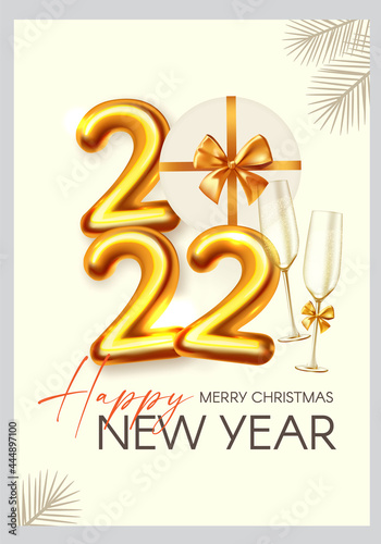 Happy New 2022 Year Party poster template with 3D realistic text, champagne glasses, fir tree branches and gift box. Festive design. Christmas flyer template