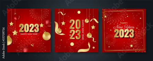 Happy new year 2023 square post card background for social media template. Red and gold 2023 new year winter holiday greeting card template. Minimalistic trendy banner for branding, cover, card.