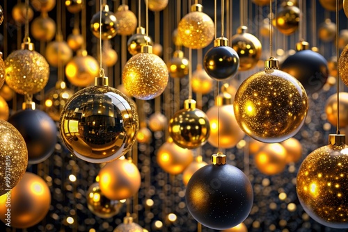 Happy New Year 2025. Christmas and New Year banner made of gold and black Christmas tree glass balls with space to copy.