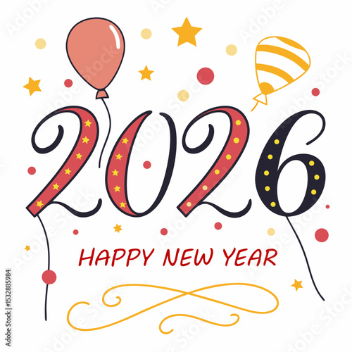2026, new year, happy new year, celebration, party, festive, balloon, star, confetti, design, illustration, graphic, typography, holiday, winter, christmas, new year's eve, background, card, banner, poster, invitation, template, vector, colourful, red, yellow, gold, white, simple, modern, minimalist, cute, fun, cheerful, joyful, bright, vibrant