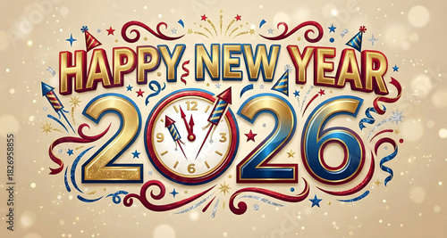 happy new year, 2026, new year's eve, celebration, festive, greeting, holiday, party, fireworks, clock, countdown, confetti, streamer, celebratory, excitement, joy, design, illustration, digital artwork, background, poster, banner, event, winter, midnight, toast