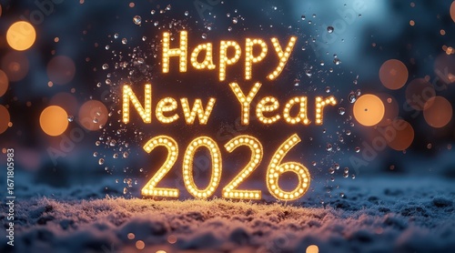 Happy new year 2026 illuminated text with bokeh lights and snow effect on ground