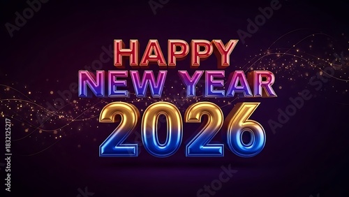 Happy new year 2026 with colorful text and golden particles on dark background