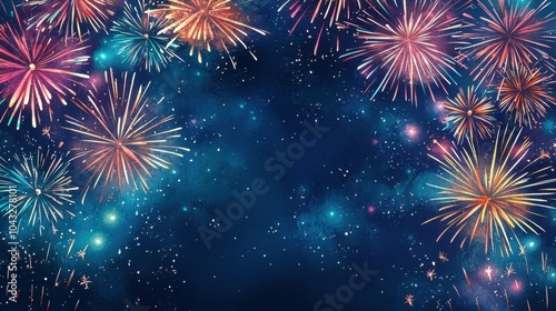 Happy New Year Celebration Background Concept. A vibrant display of colorful fireworks against a dark blue sky creating a festive and celebratory atmosphere