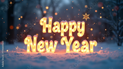 Happy New Year Illumination in Snowy Landscape. Concept of Celebration and New Beginnings.