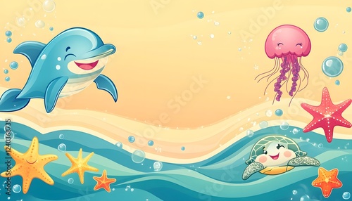 ocean, sea, beach, sand, dolphin, turtle, jellyfish, starfish, bubble, wave, summer, water, fun, cute, cartoon, illustration, happy, playful, marin, aquatic, animal, creature, wildlife, underwater, coral, reef, swimming, diving, joy, smile, friendly, adorable, charming, delightful, sweet, innocent, vibrant, colourful, bright, background, design, graphic