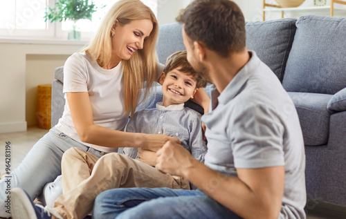 Happy parents sitting on floor next to sofa with their smiling son between them, hugging and having fun. Cheerful mother, father and their little child laughing and enjoying leisure time together.