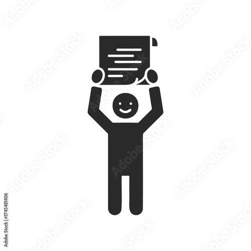 happy, person, holding, document, icon, black, white, silhouette, paper, simple, smile, arm, raised, joy, monochrome, symbol, figure, human, abstract, cartoon, minimal, cheerful, graphic, illustration, style, concept