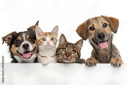 Happy Pets Peeking Over A White Banner, Sharing Joyful Smiles And Playful Energy Against A Bright White Background
