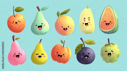 fruit, pixel, art, cute, happy, illustration, cartoon, food, apple, pear, apricot, watermelon, guava, colourful, bright, cheerful, vector, design, graphic
