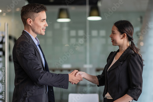 Happy positive business partners finishing meeting. Business man and woman standing in office, shaking hands, smiling, talking. Handshake concept