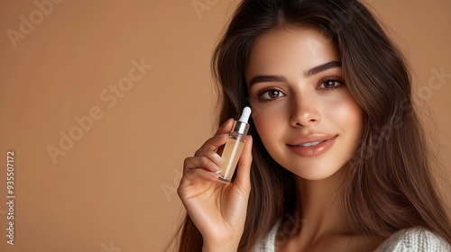 Happy pretty longhaired middle eastern woman holding pipette with beauty product applying antiaging nourishing moisturizing serum isolated on beige background Skin care routine facial : Generative AI
