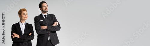 happy redhead businesswoman and confident businessman looking away isolated on grey, banner.