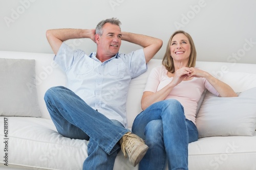 mature adult, woman, female, caucasian, man, male, house, home, lifestyle, leisure, domestic life, sitting, beautiful, pretty, attractive, smiling, happy, couple, human relationships, together, affection, partiality, closeness, love, lover, romance, romantic, living room, sofa, couch, denim, jean, indoor, looking away
