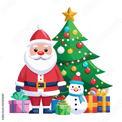christmas, santa, tree, claus, holiday, santa, gift, snow, winter, christmas, snowman, illustration, cartoon, vector, hat, celebration, card, present, decoration, new year, new, season, gift, year, happy