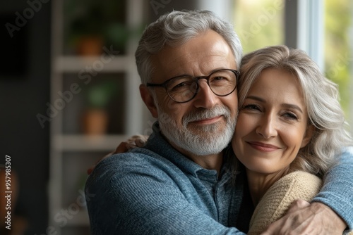 Happy senior adult mature classy couple hugging, bonding, thinking of good future.