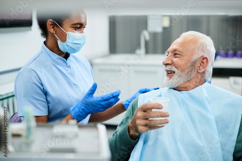 Happy senior man and dentist assistant talking during appointment at dental clinic.